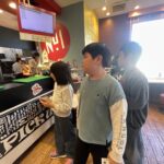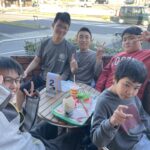 商品を受けると皆外のテラス席に座って、楽しく会話しながら食べました。